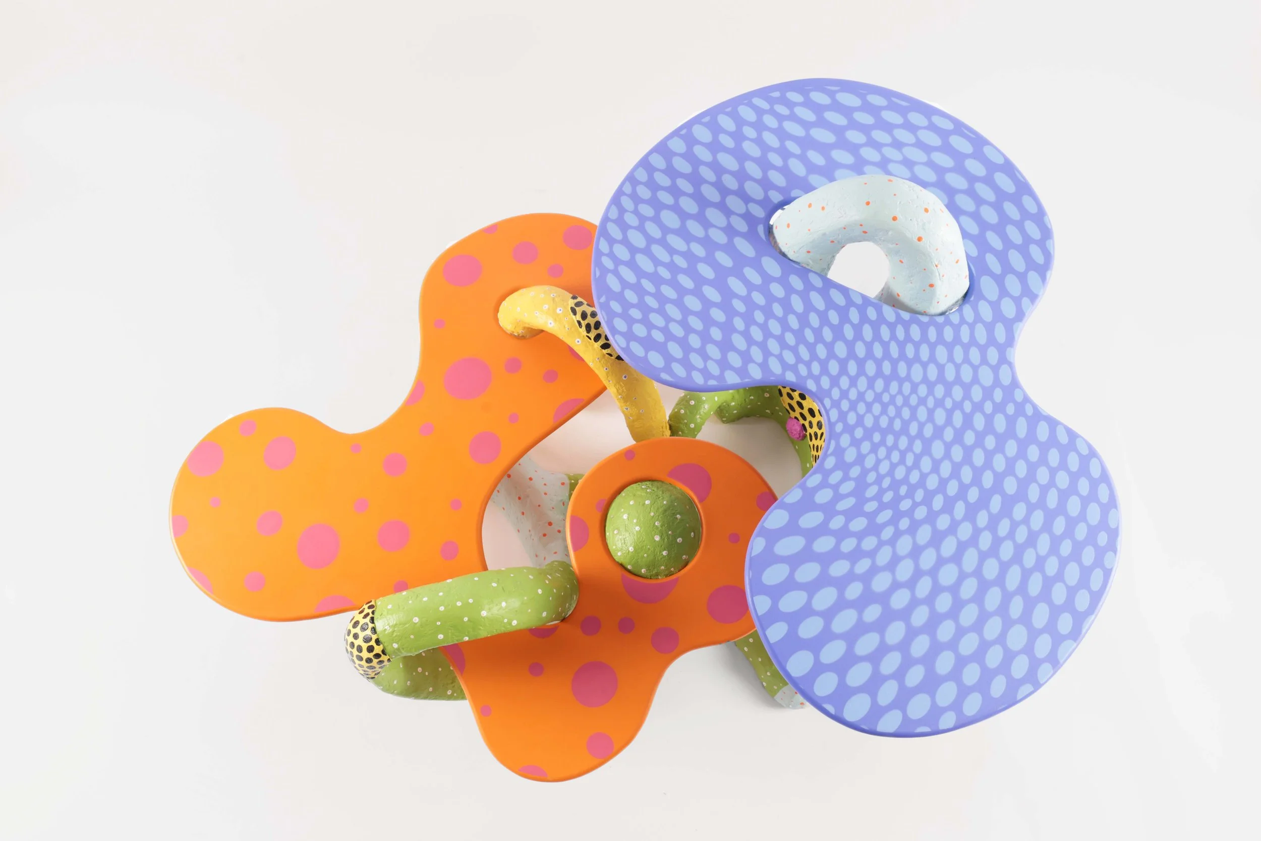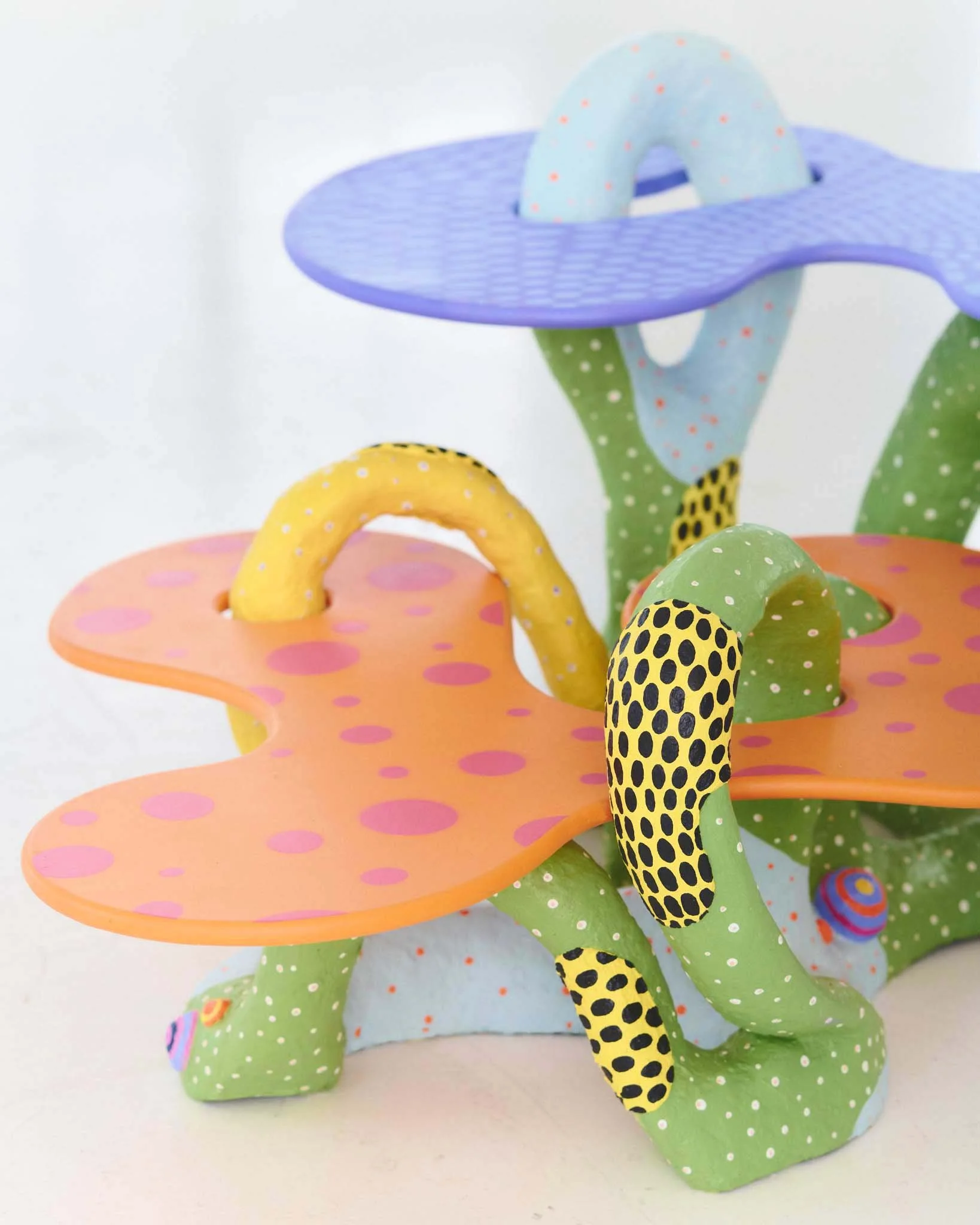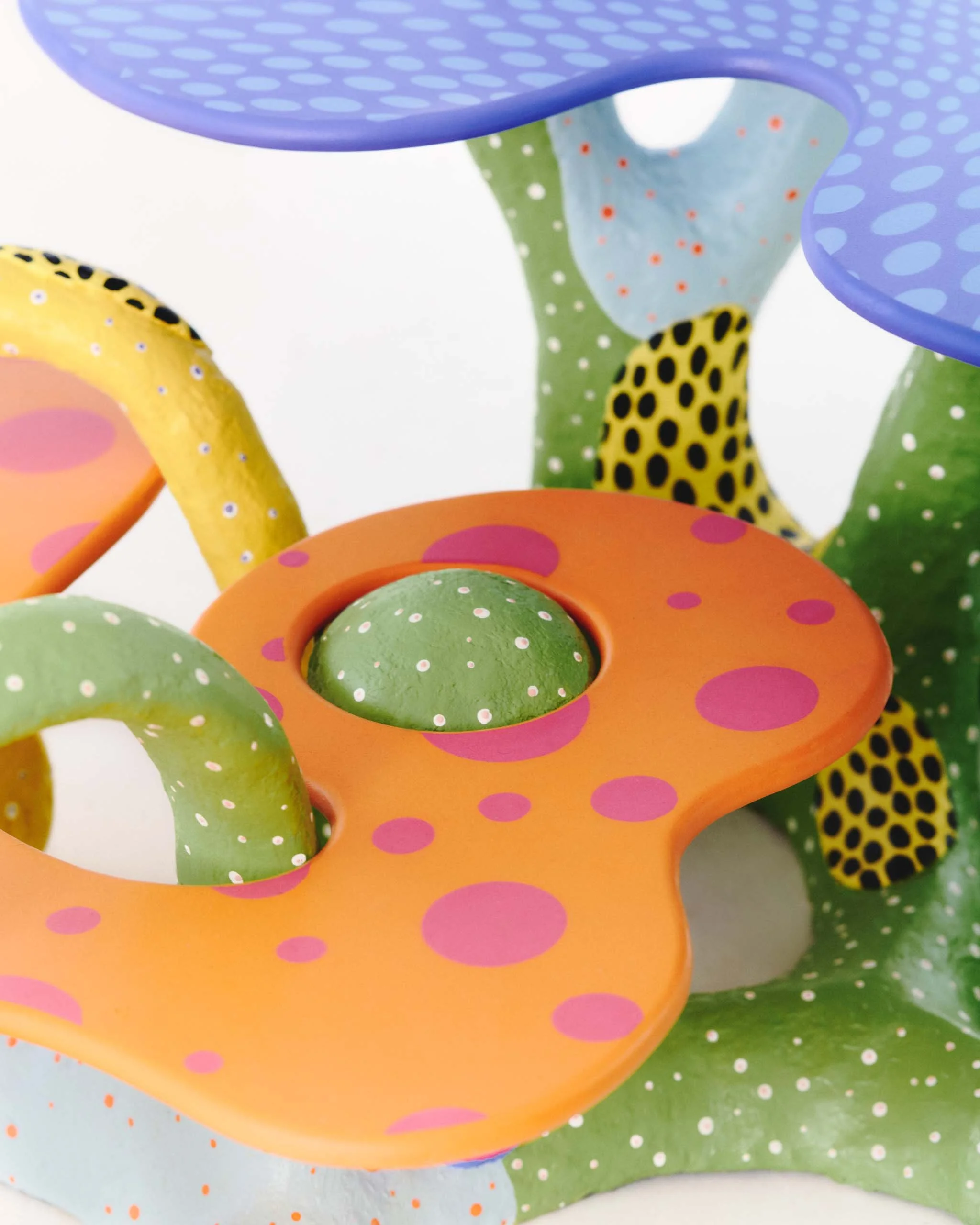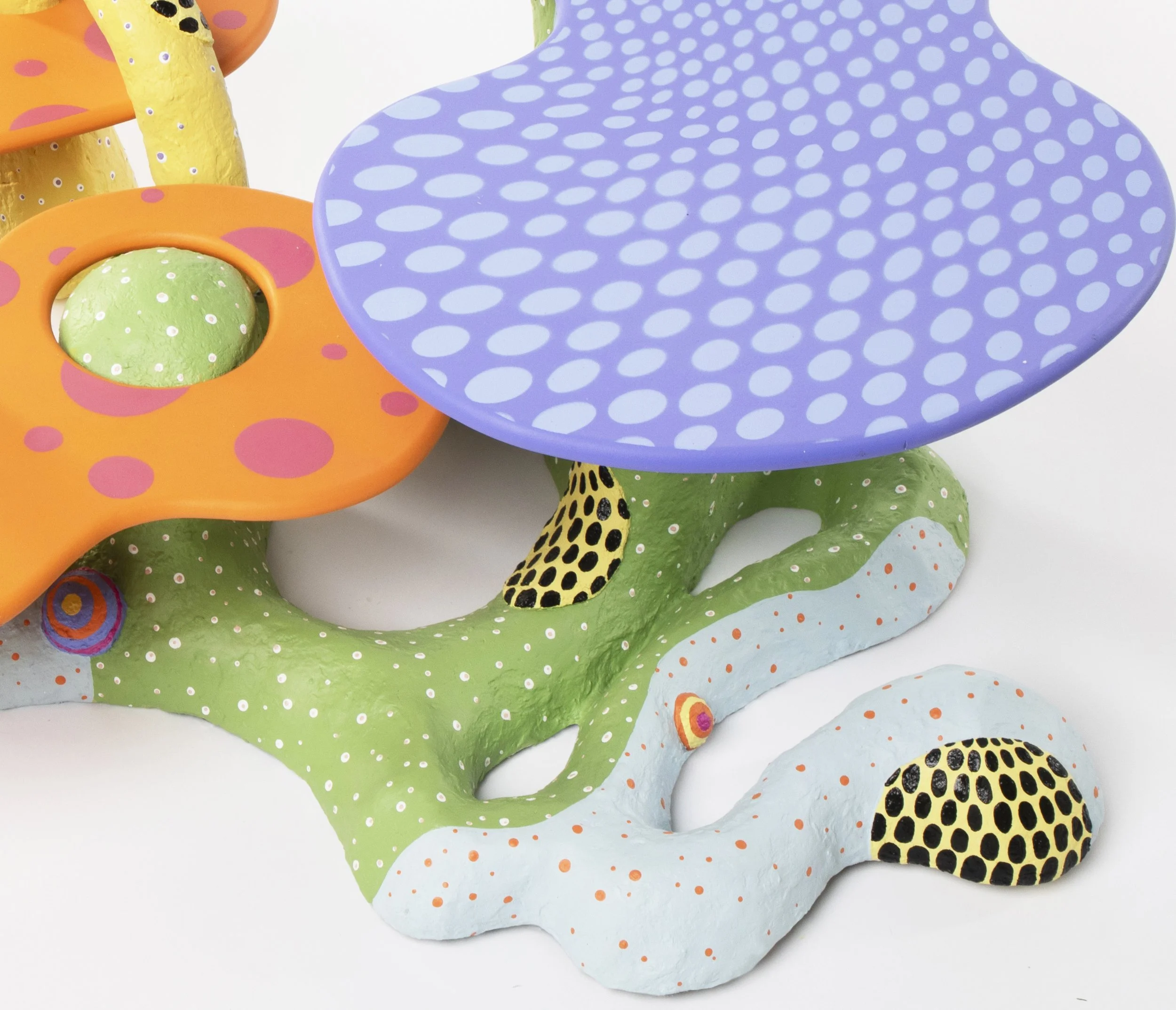 Through the language of play, the In and Around coffee table challenges our perception of furniture as inanimate . The patterned tabletops provide an animated functionality, symbiotically interwoven through the dynamic and colourful base. Combining utility and sculptural quality, its maximalist presence enlivens its surrounding space.